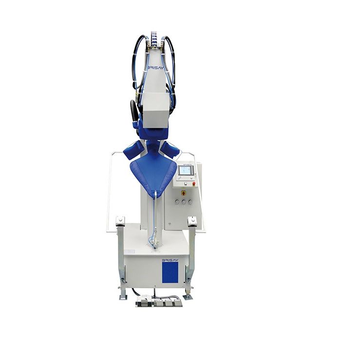High-performance collar finish pressing machine designed for tailored garments, jackets and coats. Features individually closing head bucks, adjustable lapel positions, advanced steam/suction control and a digital BRI-Fashion touchscreen programmer for precise, consistent and mark-free collar and lapel finishing.